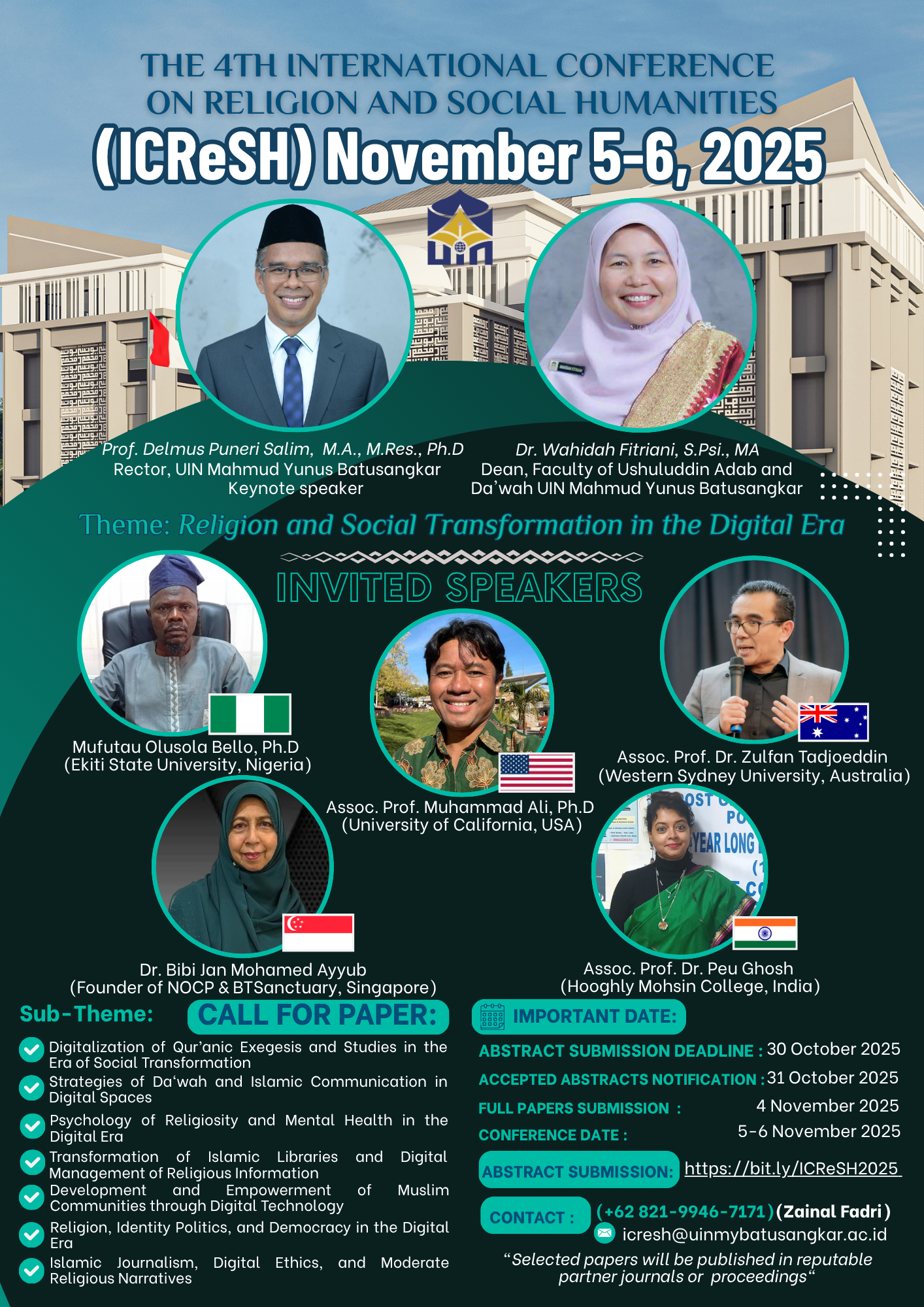 ICReSH 2025 is an international forum organized by the Faculty of Ushuluddin, Adab, and Da’wah, UIN Mahmud Yunus Batusangkar. It provides a platform for academics, researchers, students, practitioners, and policymakers to discuss the role of religion in shaping social transformation in the digital era.
